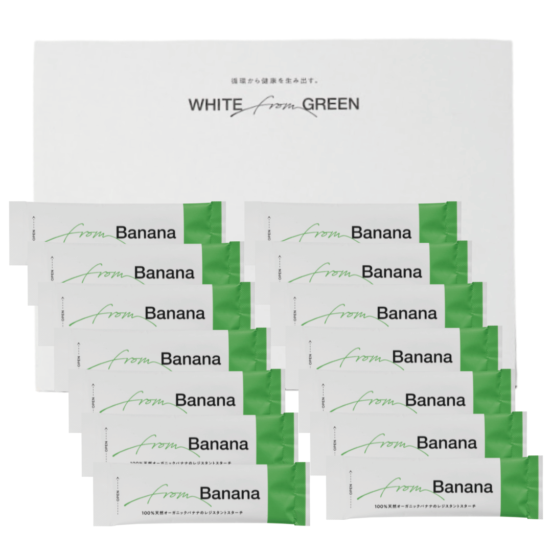 原料はオーガニックバナナだけ。RSを豊富に含んだ熟す前の緑色のバナナから抽出した未加工の天然でんぷんは発酵性食物繊維60%超と低糖質。